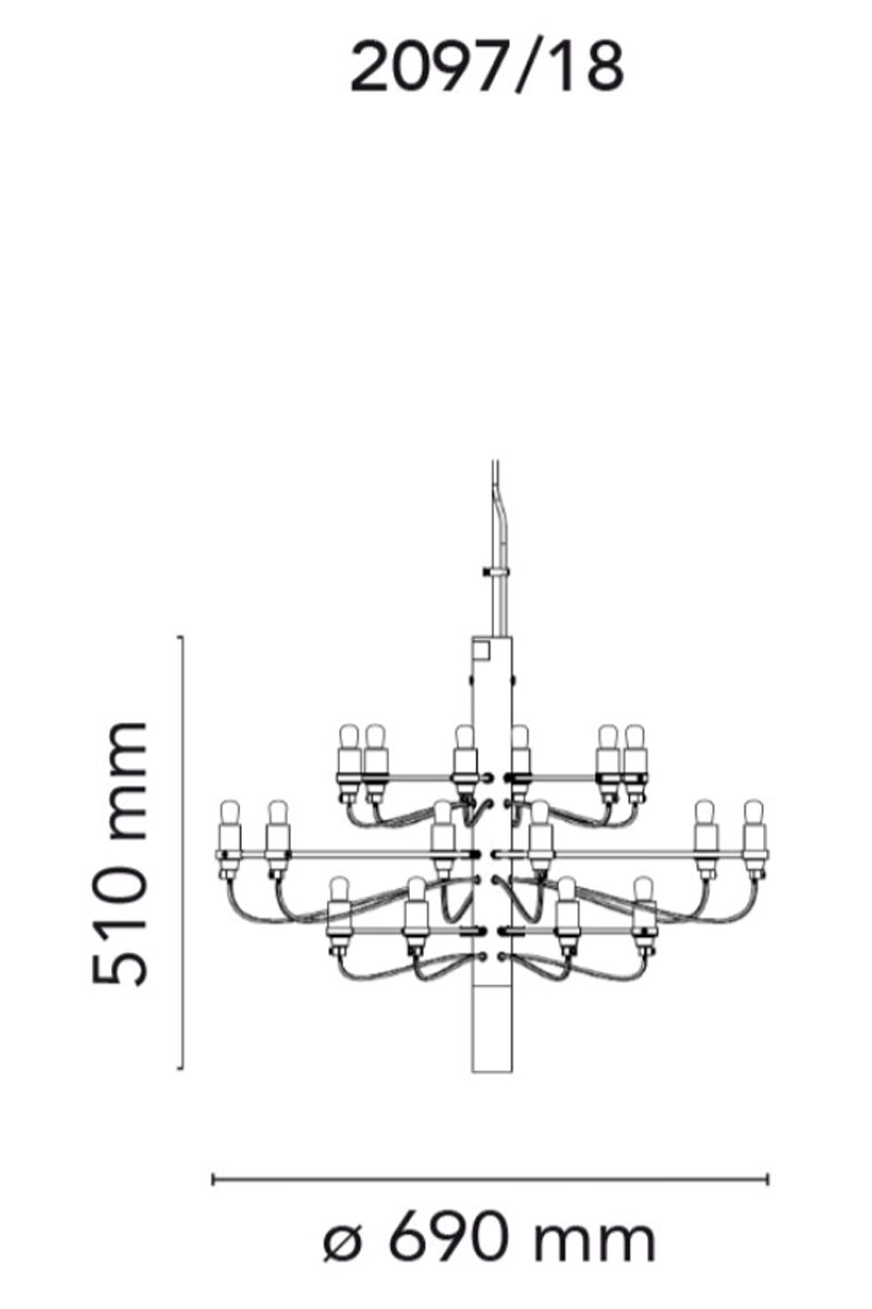 Lampada a sospensione a luce diffusa nella versione 18 luci . Struttura centrale in acciaio con bracci in ottone, entrambi disponibili nelle versioni cromata, nera opaca, bianca opaca o dorata con la scelta dI lampadine chiare o smerigliate.
